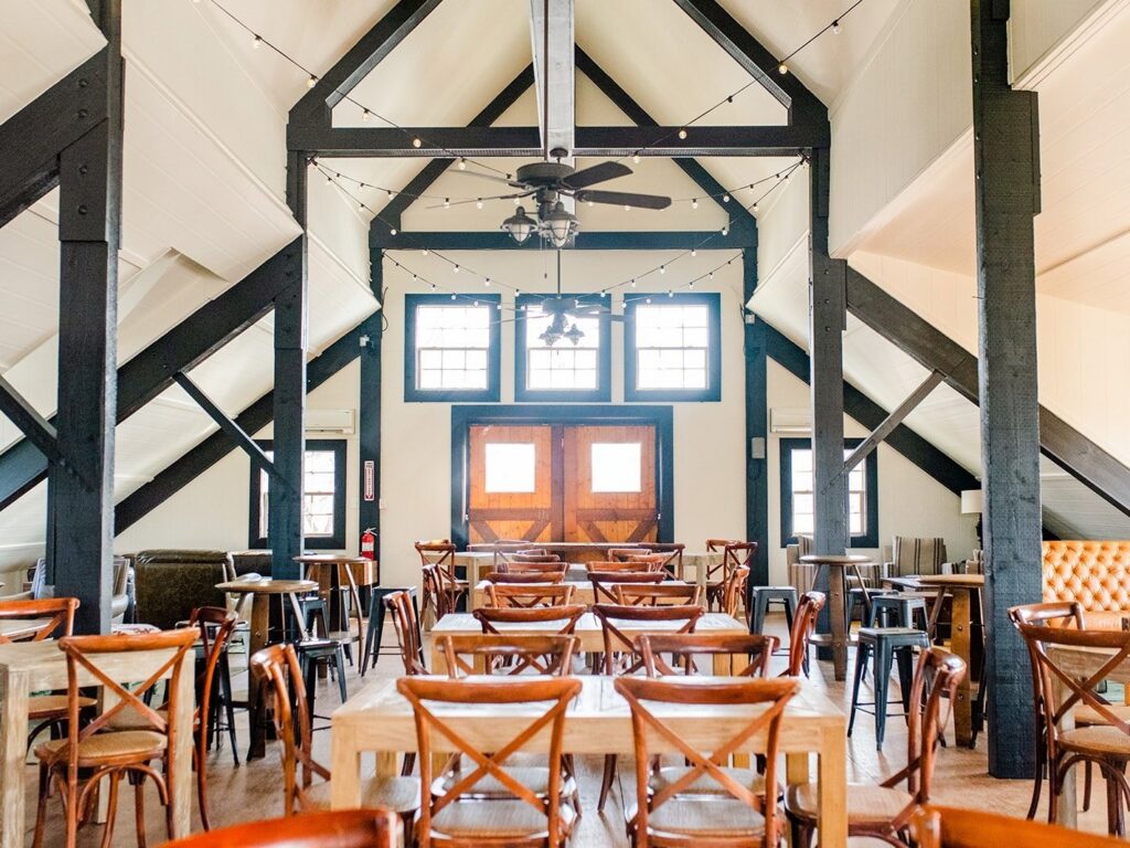 The space accommodates up to 275 guests for seated events and 300 for receptions. For larger events, a full-building buyout (excluding production areas) includes both the upstairs ballroom and the main-level tasting room, expanding capacity to 500 guests.